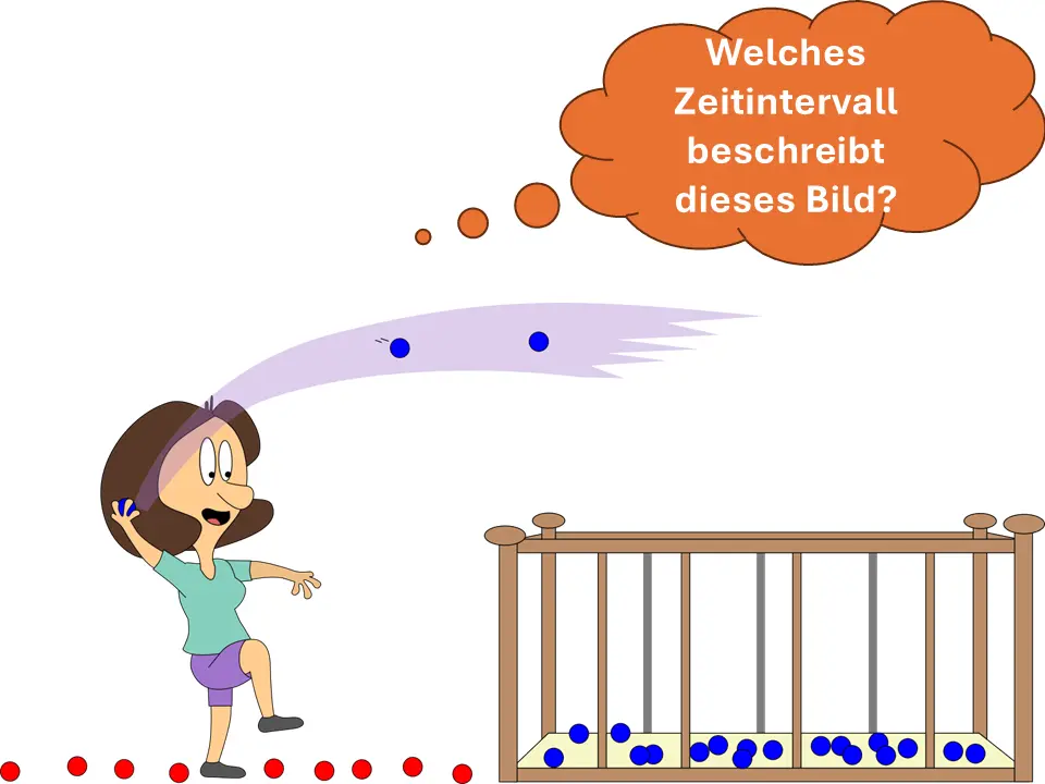 Der Zeitpunkt „wenig später“ ist dem Zeitintervall t2 -> t3 zu zuordnen, da bereits acht Bälle auf dem Boden liegen und weitere vier gerade durch die Luft fliegen. Außerdem fliegen in dem Intervall 4 Bälle aus dem Stall raus und es gilt: