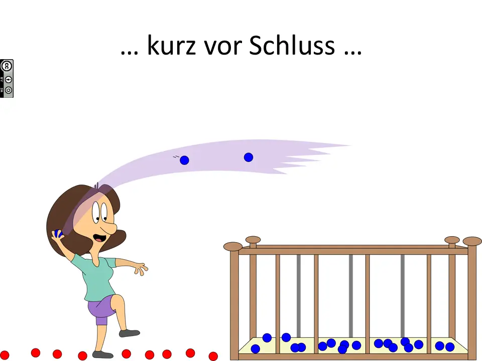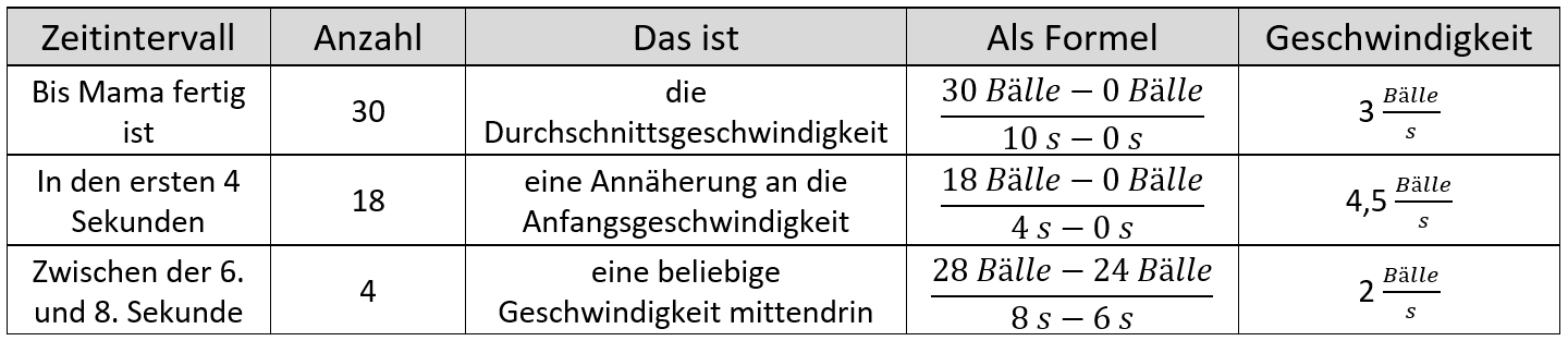 Wenn man genau hinschaut, erkennt man, dass „Mama“ nicht immer mit der gleichen Geschwindigkeit wirft. Anfangs z. B. wirft sie mit v = 5 Bälle/s, im Durchschnitt aber mit 3 Bälle/s.