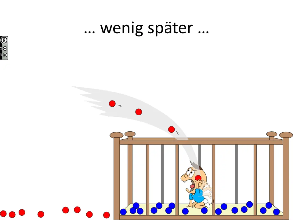 Am Nachmittag ist das Baby alleine im Kinderzimmer und stellt „die alte Ordnung“ wieder her. Für uns ganz praktisch: alle Bälle, die das Baby wirft, werden rot.