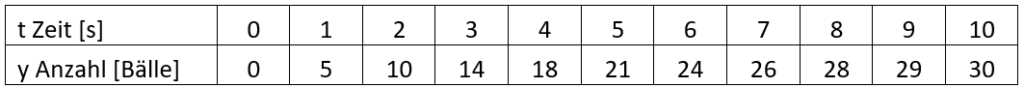 Auch hier ließe sich eine Wertetabelle erstellen, wenn wir zu mehreren festgelegten Zeitpunkten die Bälle im Laufstall zählen:
