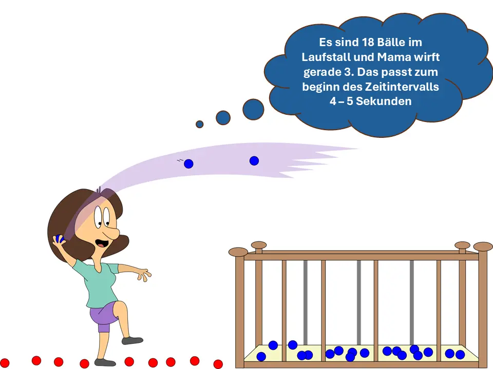 Der Zeitpunkt „wenig später“ ist dem Zeitintervall t2 -> t3 zu zuordnen, da bereits acht Bälle auf dem Boden liegen und weitere vier gerade durch die Luft fliegen. Außerdem fliegen in dem Intervall 4 Bälle aus dem Stall raus und es gilt: