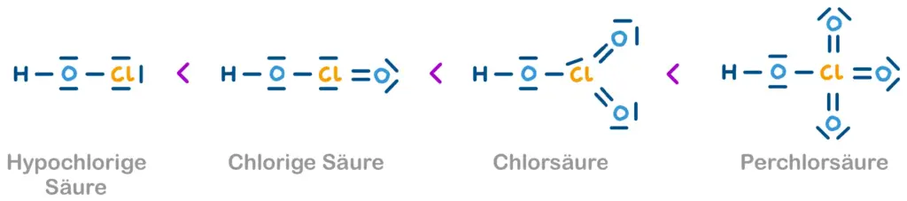 Sauerstoffsäuren des Chlors. Mit jedem weiteren Sauerstoffatom am zentralen Chloratom nimmt die Säurestärke von links nach rechts zu.