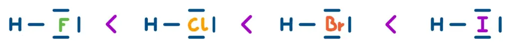 Obwohl HF sehr polar ist, ist es unter den Halogenwasserstoffen nicht die stärkste Säure, weil die H-F-Bindung ungewöhnlich stark ist.