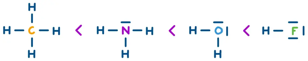 Kohlenstoff, Stickstoff, Sauerstoff und Fluor befinden sich im Periodensystem innerhalb einer Periode. Die Elektronegativität von X nimmt von links nach rechts zu.