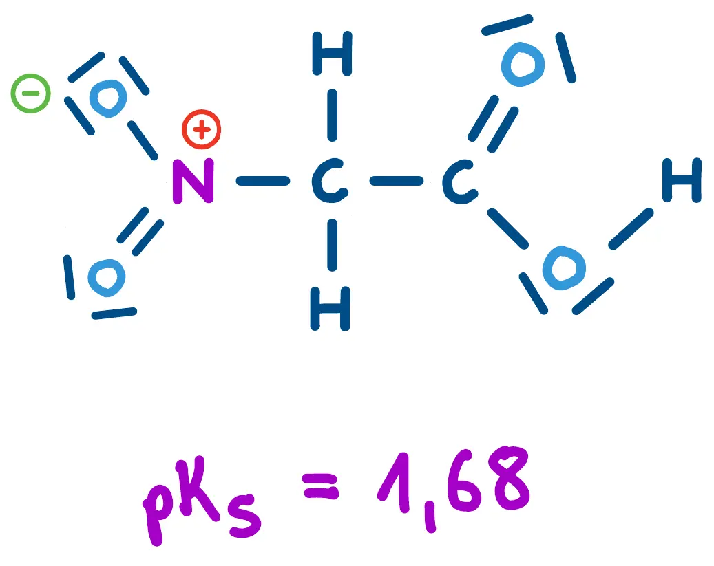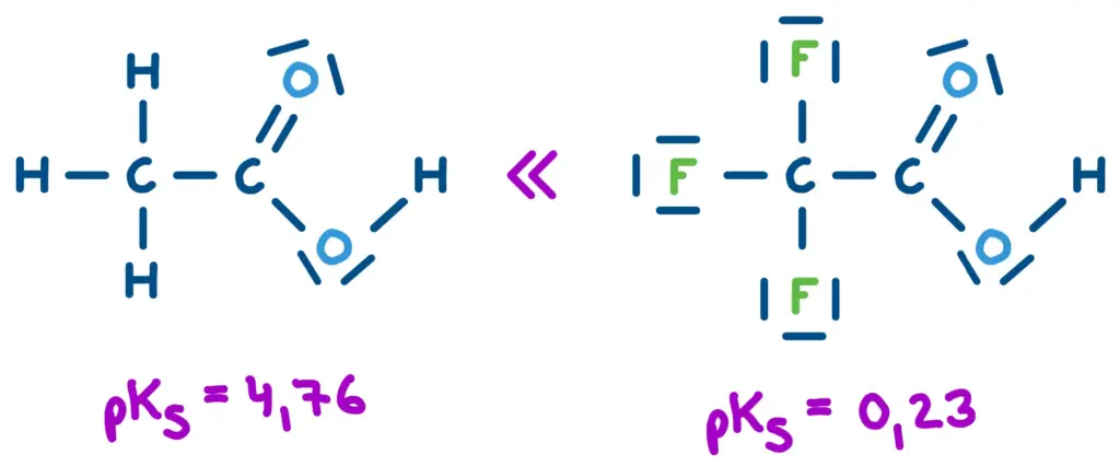 Elektronenziehende Gruppen (z.B. -NO2, -F, -CF3) verstärken die saure Wirkung der Carboxygruppe (negativer induktiver Effekt bzw. -I-Effekt). Trifluoressigsäure (F3C-COOH) ist deutlich stärker sauer als Essigsäure, weil die CF3-Gruppe einen starken -I-Effekt aufweist.