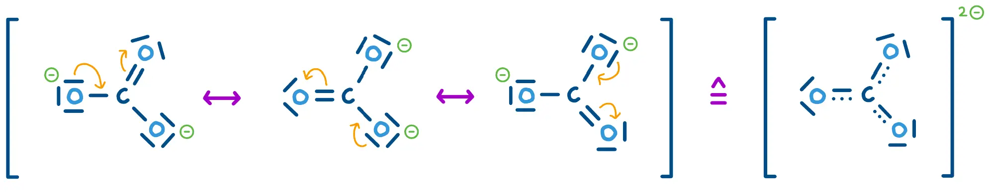 Grenzformeln des Carbonat-Ions. Die gestrichelten Linien in der rechten Darstellung kennzeichnen Bindungen, die in Wirklichkeit delokalisiert sind.