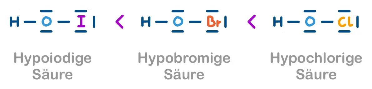 Die Säurestärke nimmt bei den Halogenwasserstoffsäuren von Fluorwasserstoff über Chlorwasserstoff und Bromwasserstoff bis zum Iodwasserstoff zu. Dies liegt daran, dass das größere Iodatom die Bindung zum Wasserstoff schwächt, wodurch das Proton (H+) leichter abgespalten werden kann.