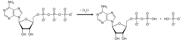 Spaltung von ATP in ADP und ein Hydrogenphosphat-Ion.