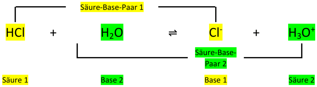 Bei einer Säure/Base-Reaktion findet ein Protonenübergang (= Protolyse) von einem Säure-Teilchen auf ein Base-Teilchen statt. Betrachtet man verschiedene Säure-Base-Reaktionen, so erkennt man Teilchenpaare, bei denen die beiden Teilchen sich jeweils um ein Proton unterscheiden, wie z.B. HCl und Cl, H3O+ und H2O.