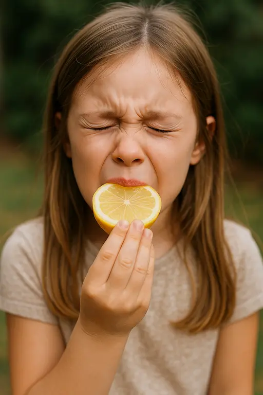 Ein junges Mädchen beißt in eine Zitronenscheibe.8