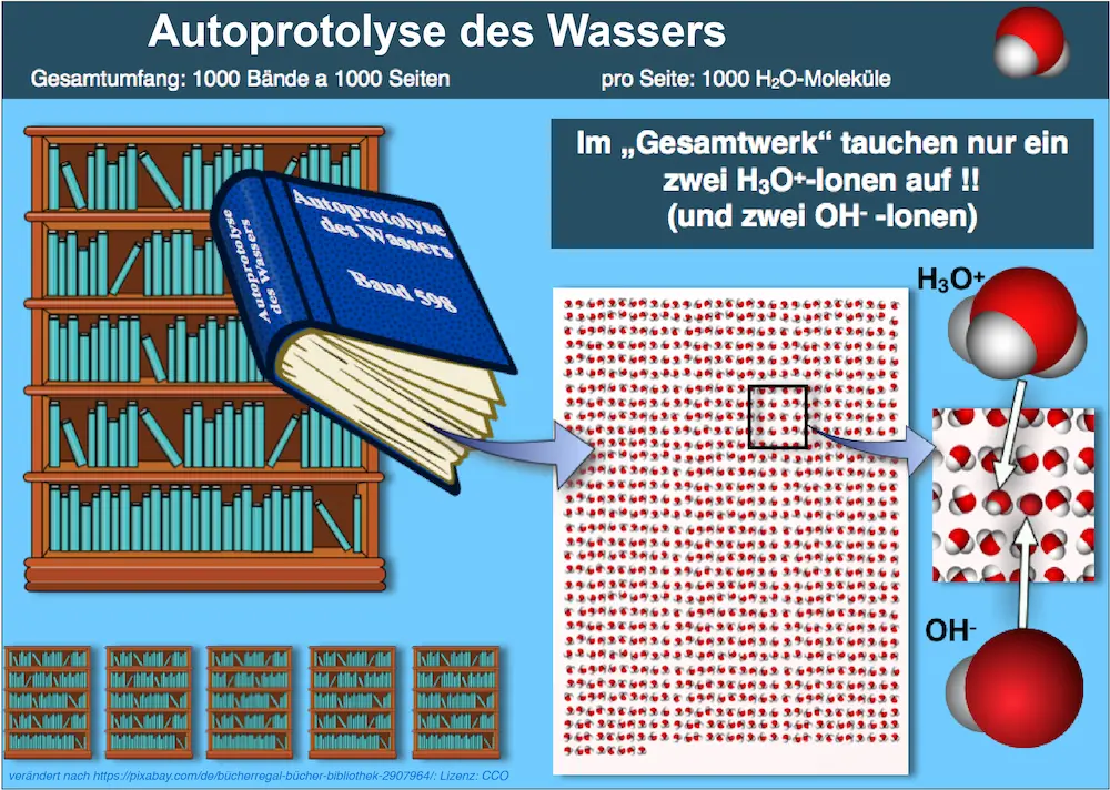 Dadurch entstehen in reinem Wasser stets geringe Mengen an Oxonium-Ionen (H3O+) und Hydroxid-Ionen (OH–). Ihre Konzentration ist sehr klein, lässt sich aber nachweisen und wird in der folgenden Darstellung anschaulich verdeutlicht.