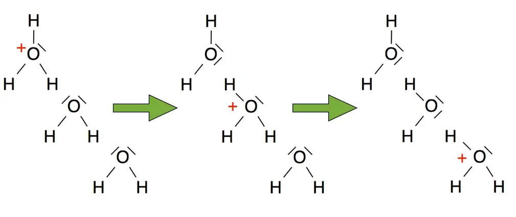 Vereinfachte und schemenhafte Darstellung des Grotthuß-Mechanismus.