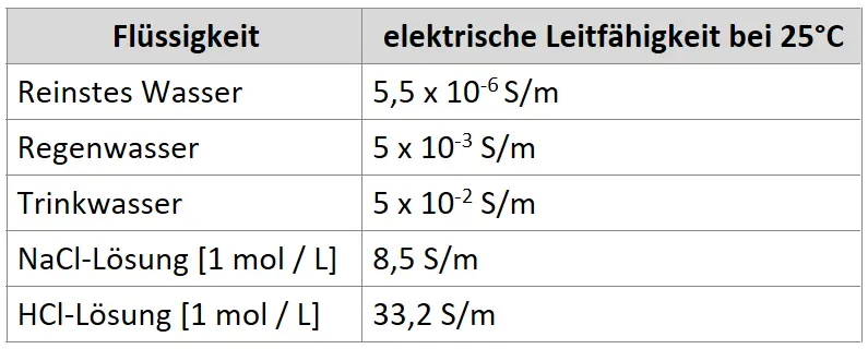 Wässrige Lösungen von Salzen leiten den elektrischen Strom. Die elektrische Leitfähigkeit einer Salzsäure-Lösung ist um ein Vielfaches größer. Reinstes Wasser weist jedoch auch eine elektrische Leitfähigkeit auf!