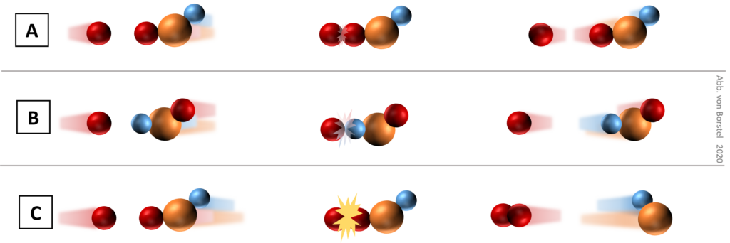 Teilchen vor, während und nach der Kollision. Stoß A und Stoß B sind ineffektiv, Stoß C ist effektiv2