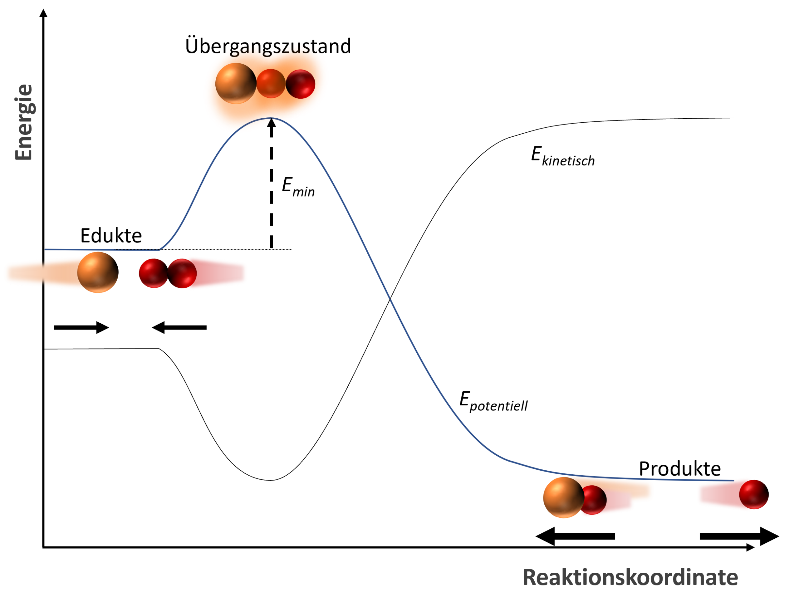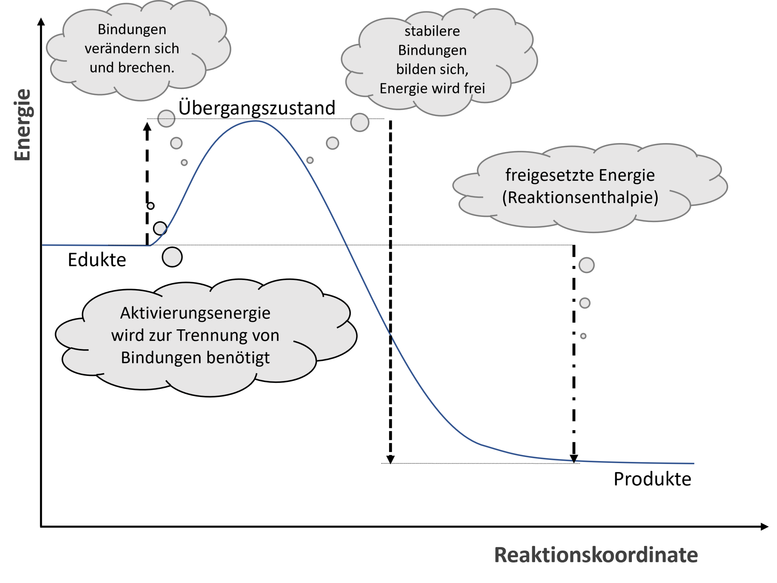 Wie Sie bereits wissen, erfolgen chemische Reaktion erst bei einer sogenannten Aktivierungsenergie (Abb. 2). Dies liegt daran, dass auf Teilchenebene Bindungen aufgebrochen werden müssen.