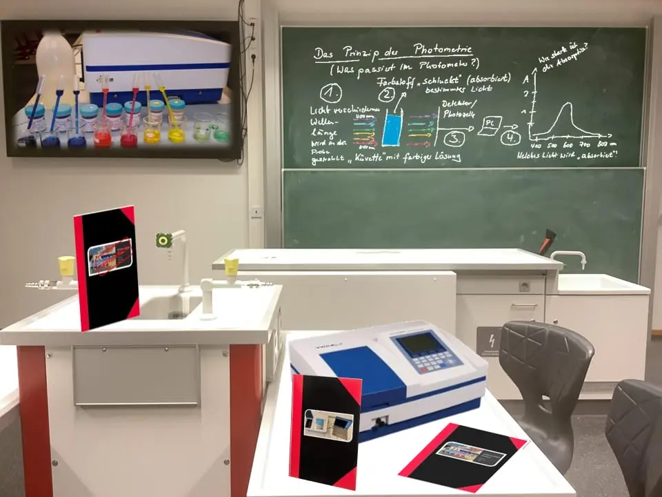 - Schauen Sie sich im „digitalen Labor“ um und machen Sie sich mit Hilfe des Laborbuchs Nr. 1 mit dem Prinzip der Fotometrie und der Handhabung des Fotometers vertraut.
