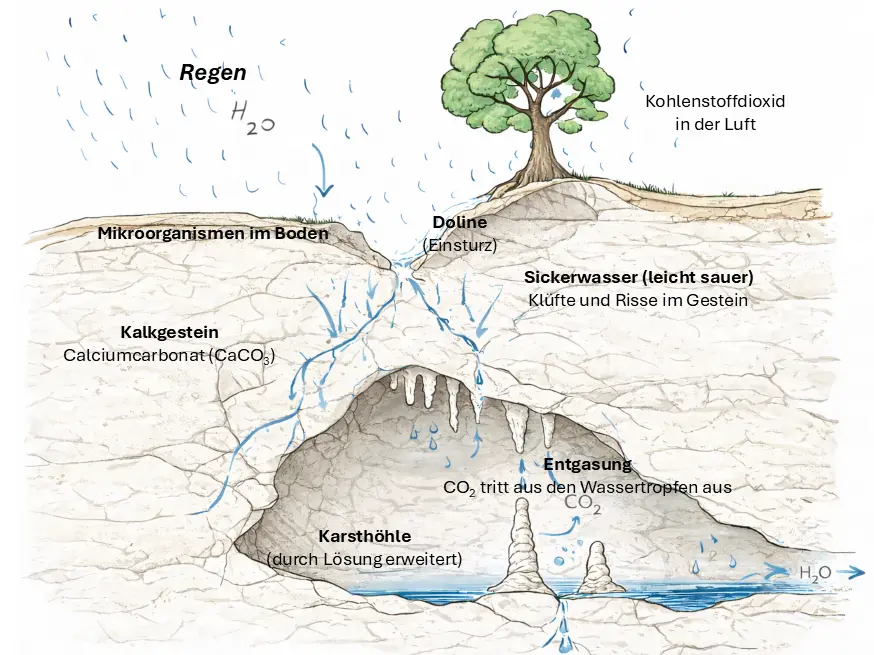 Dabei ist Kalk (Calciumcarbonat, CaCO3) in Wasser nahezu unlöslich. Es kann sich aber aus Kalk und Kohlenstoffdioxid in wässriger Lösung gut lösliches Calciumhydrogencarbonat bilden und umgekehrt: