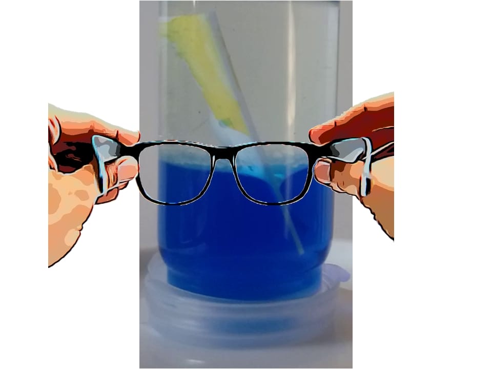 - Öffnen Sie das Gefäß und geben Sie mit der Pinzette zügig das Kunststoffplättchen so hinein, dass die Seite mit der gelben Farbe nach unten zeigt.